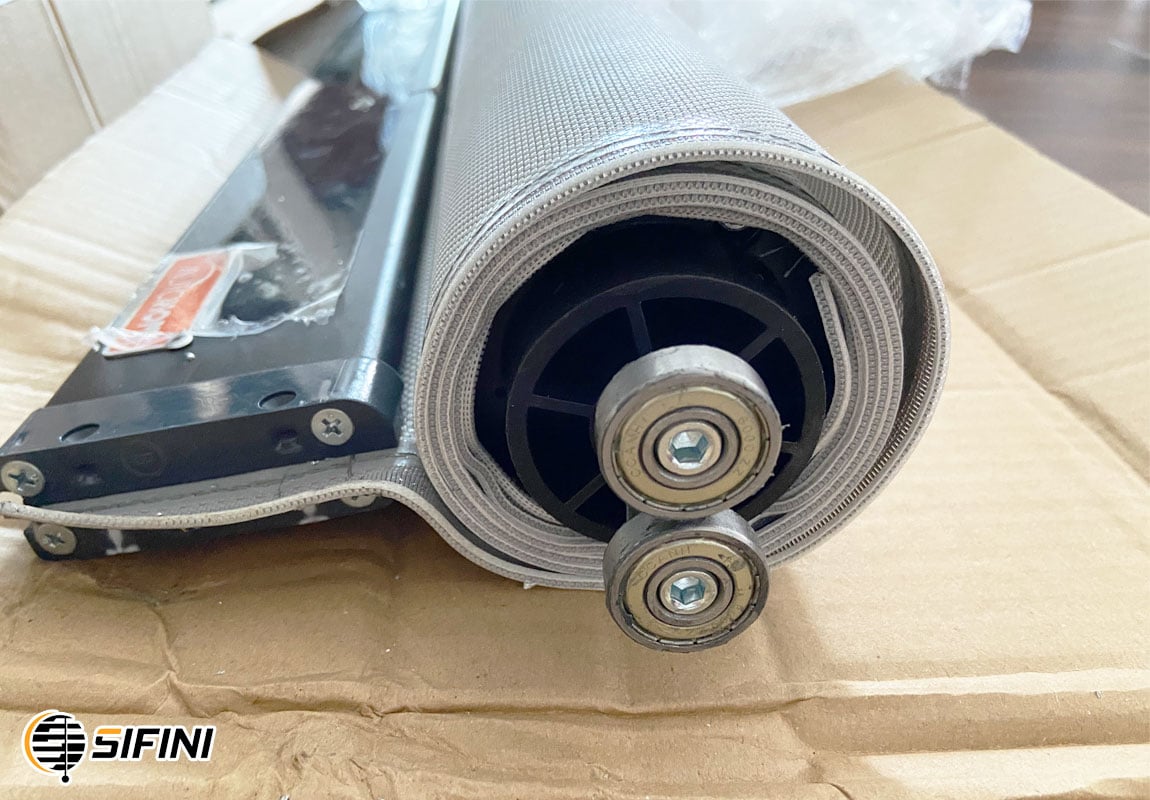 Phần rèm lưới sẽ được cuộn vào trong ống cuộn và được che bởi hộp máng, rèm sẽ được chạy trong 2 thanh dẫn hướng 2 bên để cố định rèm không bị gió tác động, khi rèm đi xuống gặp phải vật cản thì rèm sẽ tự động đứng lại nên rất an toàn cho trẻ em.